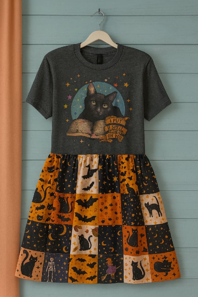 🖤✨ Black Cat "I Put a Spell on You" Patchwork Smock Dress – Medium fit – with pockets! A true witchy wardrobe staple.