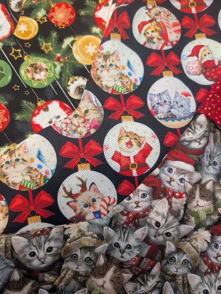 Classic festive tones with adorable cats in baubles.