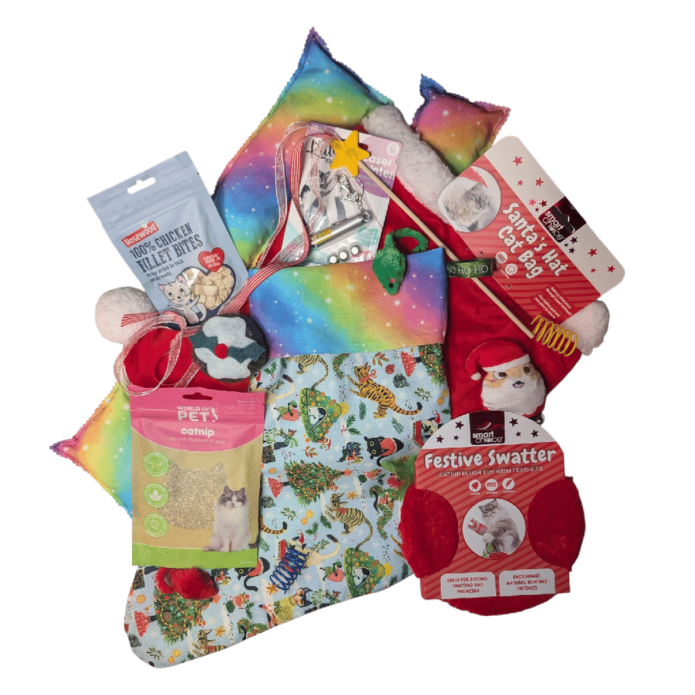 Every stocking is absolutely stuffed with a mix of handmade toys and carefully chosen festive favourites. The contents are worth far more than the price of the stocking — if purchased individually through the shop, the items would total significantly higher (for example, catnip bags normally £5–6 each, hats £8, toys £4–6, etc).
